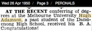 After the war, Hugh known as Peter returned to Beaconsfield. He played football for Beaconsfield and was the secretary for the Berwick & District State Schools Sports Association.