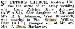 | Married | Sydney William Dean on 30 June 1945 at St Peter’s Church Melbourne |
